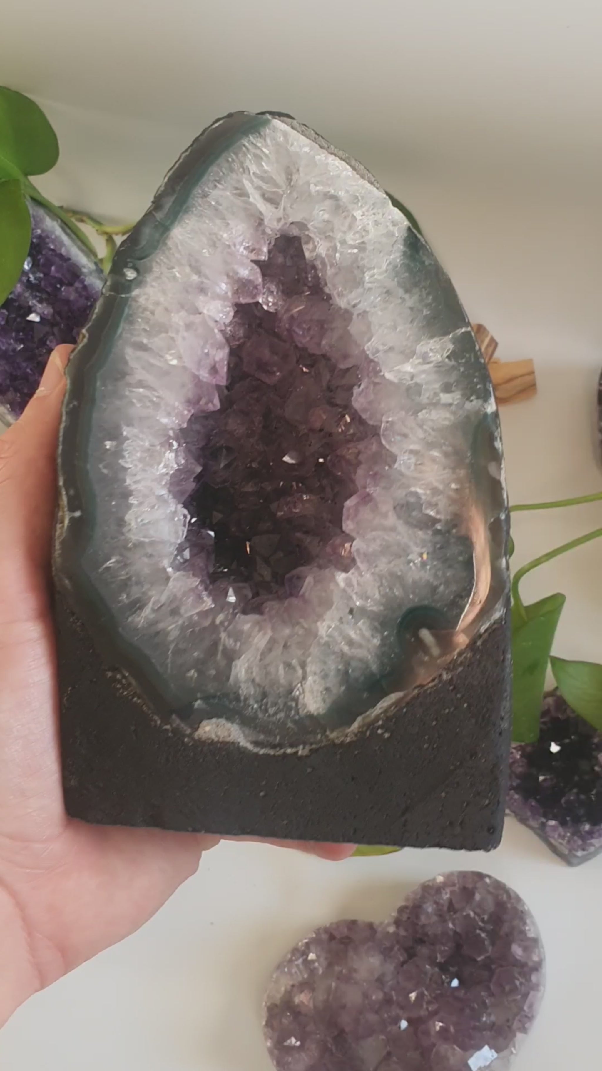 Mit 18 cm ist die Geode ein starker Blickfang für Regal, Sideboard oder Schreibtisch und passt perfekt in jede Mineralien- oder Kristallsammlung. Dieses Stück wurde von uns handverlesen und in hoher Steinqualität ausgewählt.