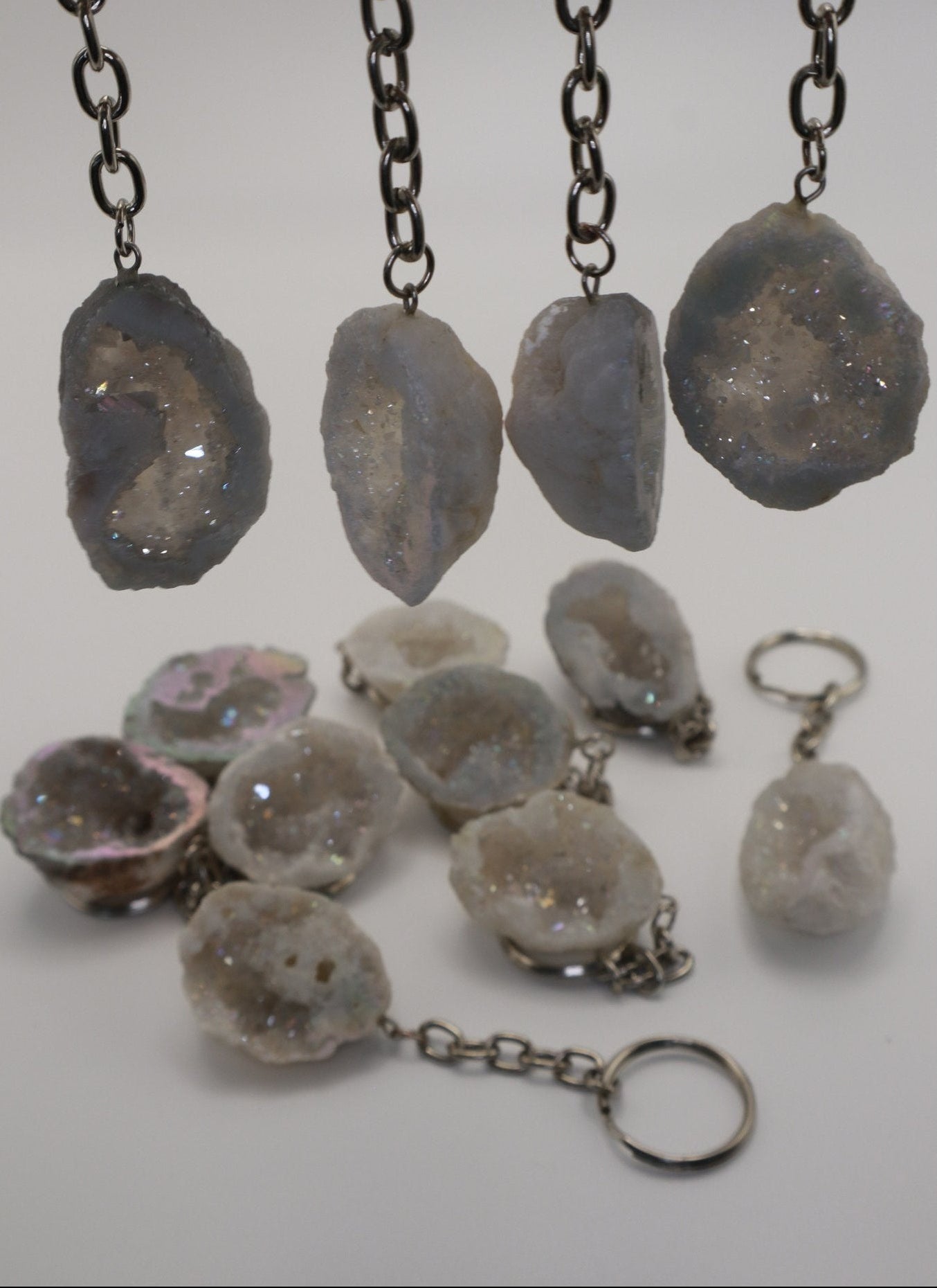 Diese Angel Aura Geoden Schlüsselanhänger (20–40 mm) sind kleine Hingucker mit schimmerndem, irisierendem Effekt. Die Basis ist eine echte Quarzgeode, die von uns handverlesen und in hoher Steinqualität ausgewählt wird – dadurch ist jedes Stück in Form und Struktur unterschiedlich.