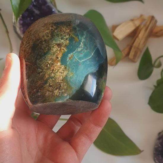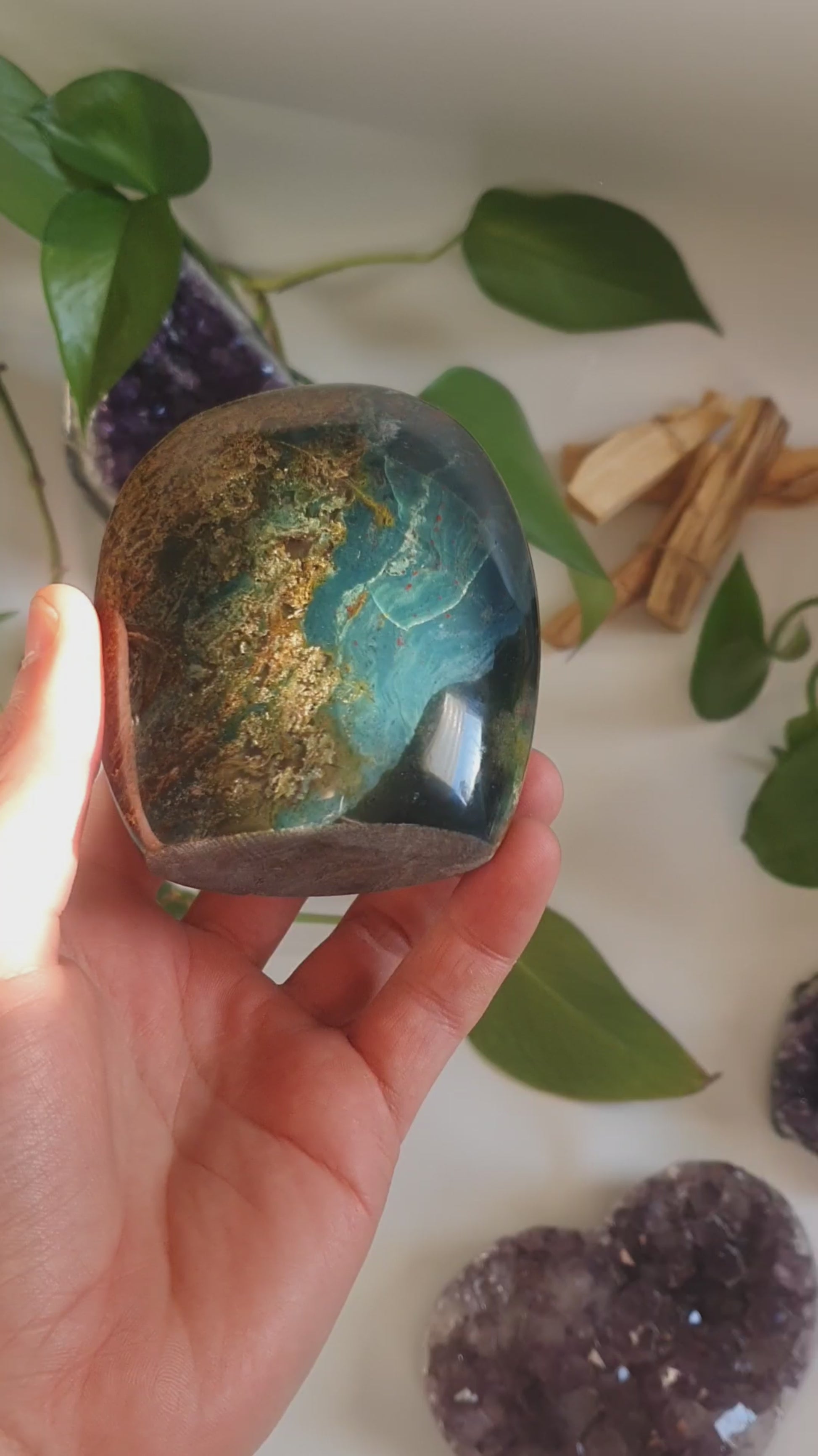 Diese Ozean-Jaspis Freiform aus Madagaskar begeistert mit ihrem lebendigen Farbspiel und den typischen, oft kreisförmigen Zeichnungen, die jedes Stück so besonders machen. Durch die Politur wirken Muster, Kontraste und natürliche Details besonders klar und edel – ein echter Blickfang mit einzigartigem Charakter.