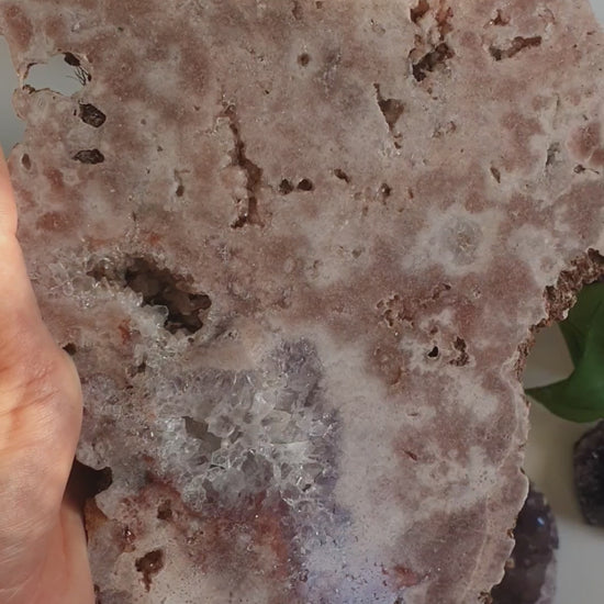 Dieses Pink Amethyst Stück auf Standfuß ist ein echtes Statement: groß, präsent und mit einer faszinierenden Kristallfläche, die je nach Licht sanft glitzert. Die rosigen bis leicht violetten Nuancen wirken besonders edel und machen das Stück zu einem Blickfang, der sofort auffällt.