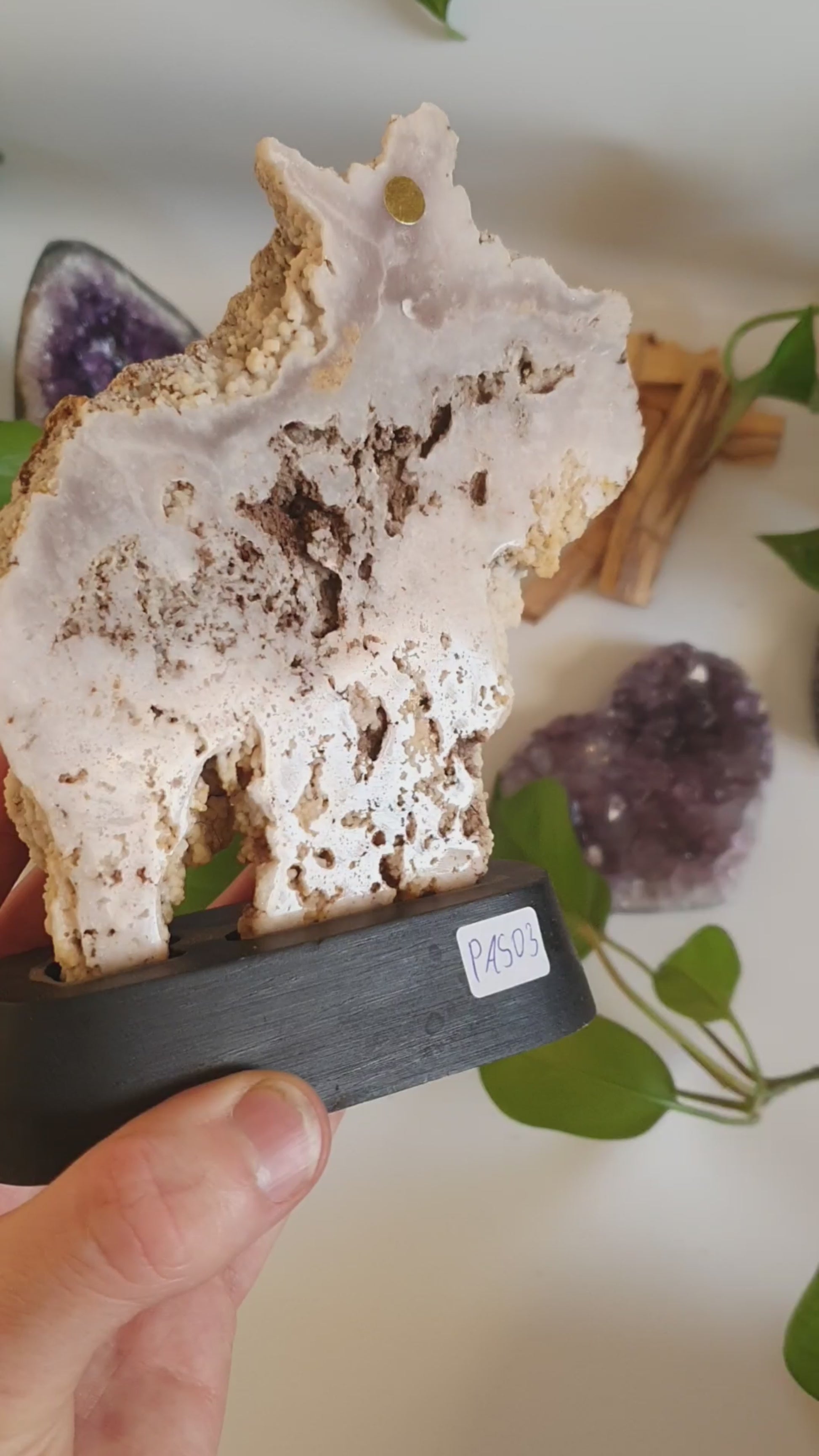 Dieses Pink Amethyst Stück auf Standfuß ist ein echtes Statement: groß, präsent und mit einer faszinierenden Kristallfläche, die je nach Licht sanft glitzert. Die rosigen bis leicht violetten Nuancen wirken besonders edel und machen das Stück zu einem Blickfang, der sofort auffällt.